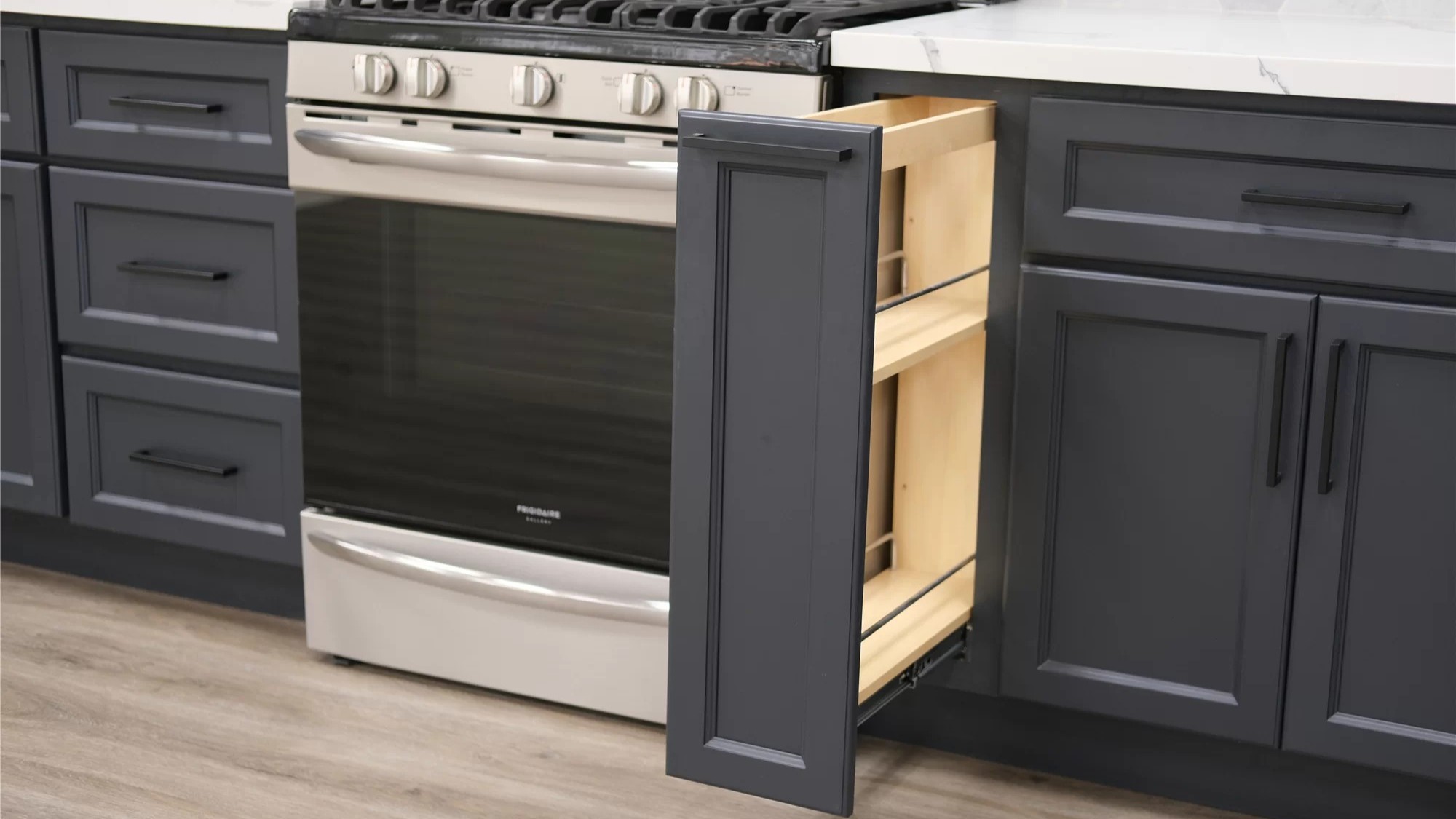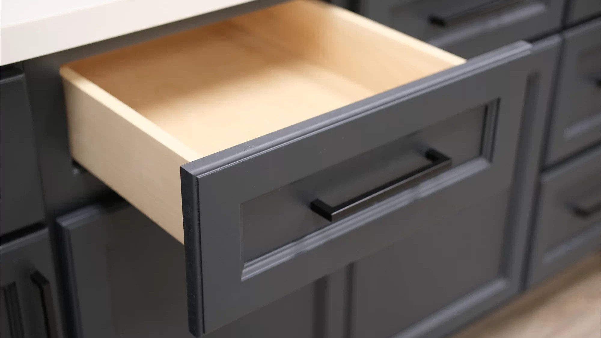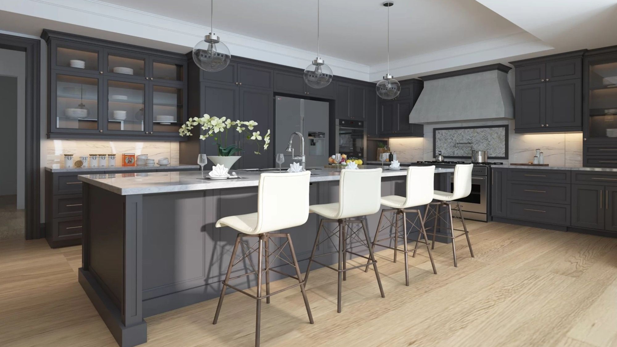 Charcoal Grey cabinets bring depth and drama with their bold, dark color. This rich tone creates a striking contrast that elevates any kitchen design.